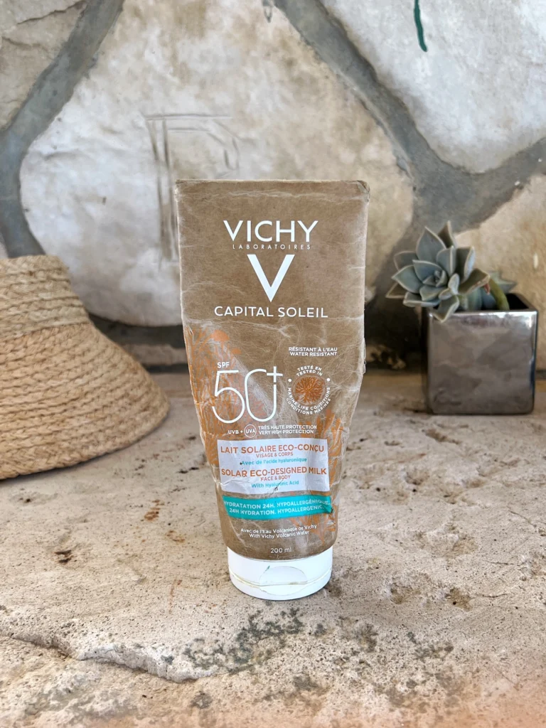 Vichy Capital Soleil EKO mleko z zelo visoko zaščito za obraz in telo s hialuronsko kislino zagotavlja 24-urno vlaženje. Formula je hipoalergena in dermatološko preizkušena na občutljivi koži.