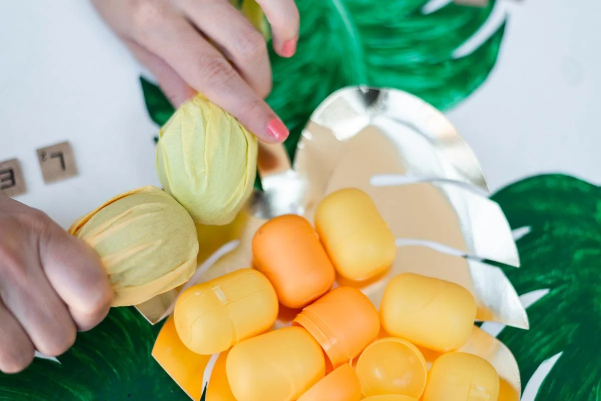 2. Kinderjajček rumenjake preluknaj na vrhu pokrova. To storiš s škarjicami, segreto kovinsko (na primer kitajsko) paličico ali kar z vžigalico (v tem primeru postane obod luknje črn). Če imaš druga plastična jajčka, npr. velikonočna, jih zavij v rumen krep papir, da bodo videti kot limone.